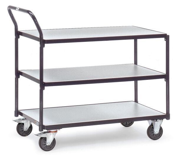 Elektrisch leitfähige Ausführung. Stahlrohr und Profilstahl geschweißt, elektrisch leitfähig pulverbeschichtet, schiefergrau RAL 7015. Schraub- und Steckkonstruktion. Böden aus elektrisch leitfähiger Holzwerkstoffplatte nach DIN 68765, hellgrau. 2 Lenk- und 2 Bockrollen, Räder mit TPE-ESD-Bereifung (thermoplastisches Elastomer), elektrisch leitfähig, Naben mit Präzisions-Rillenkugellager. Feststeller an den Lenkrollen, gemäß der Europäischen Norm EN 1757-3 (Sicherheit von Plattformwagen).