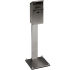 Großvolumiger Ascher mit Schutzdach, Standfuß und Bodenplatte komplett aus Edelstahl gefertigt. Ausgerüstet mit Doppelbartschloss (1 Schlüssel). Zur Entleerung wird der Aschekasten nach vorne geklappt. Maße: 180 x 150 x 410 mm hoch, Gesamthöhe mit Fuß 1090 mm, Bodenplatte 310 x 310 mm. Nutzinhalt ca. 3,7 Liter. Lieferung inkl. Montagematerial zur Bodenbefestigung.